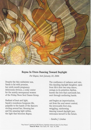 The card to the right was created as a result of the Vision and the Word 3. For that show I was working with Eau Claire artist Bill Benson. I wrote a poem based on an experience I had with a local women's interpretive dance group: Sarah Aiken, one of the dancers, was nine months pregnant and we danced around her, giving loving care to her and to her soon to be born child. A few days after she gave birth, I wrote "Rayna in Utero Dancing Toward Daylight." During our year of collaboration, Bill created an amazing foil painting as a result of the poem and he entitled it Day Dancer. The painting and the poem were displayed at the Regional Arts Gallery in September 2006 as part of the show. For a year after the show was over, the painting traveled around the Chippewa Valley temporarily residing in the homes of each of the dancers. Finally it went to live in Rayna's home in Eau Claire. Rayna was by then a toddler. In 2010 with Bill Benson's permission, Sara Bryan, the leader of the dance group, created a card from her original photograph so that we all could keep the memory of that wonderful day. The Vision and the Word has inspired wide community connections. The beauty and love created is part of the reason the Vision and Word has endured.