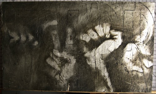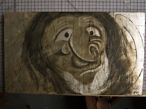 1) remind, based on indian masks of false faces 12 x 20 in, oil on silver leaf on plywood