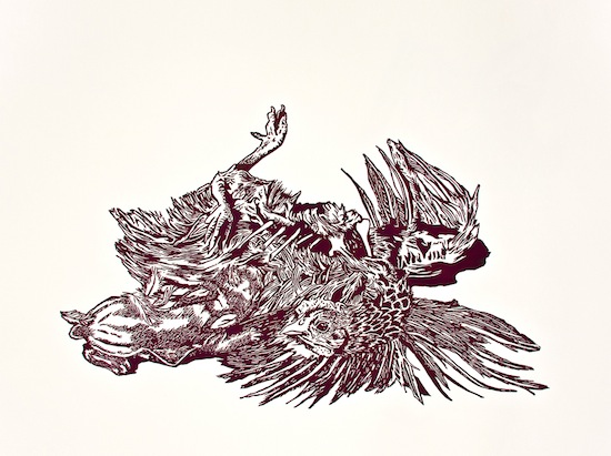 Jenie Gao (Milwaukee) Jenie Gao makes prints that manage to be simultaneously both very gorgeous and disturbing. Animals and landscapes transform weirdly into deeply personal representations. Many of her pieces, like this one, are hugely extra-informed by their brief titles. She often prints tiny broadsides, as well, to go with the visual art she makes. (Nick Demske)